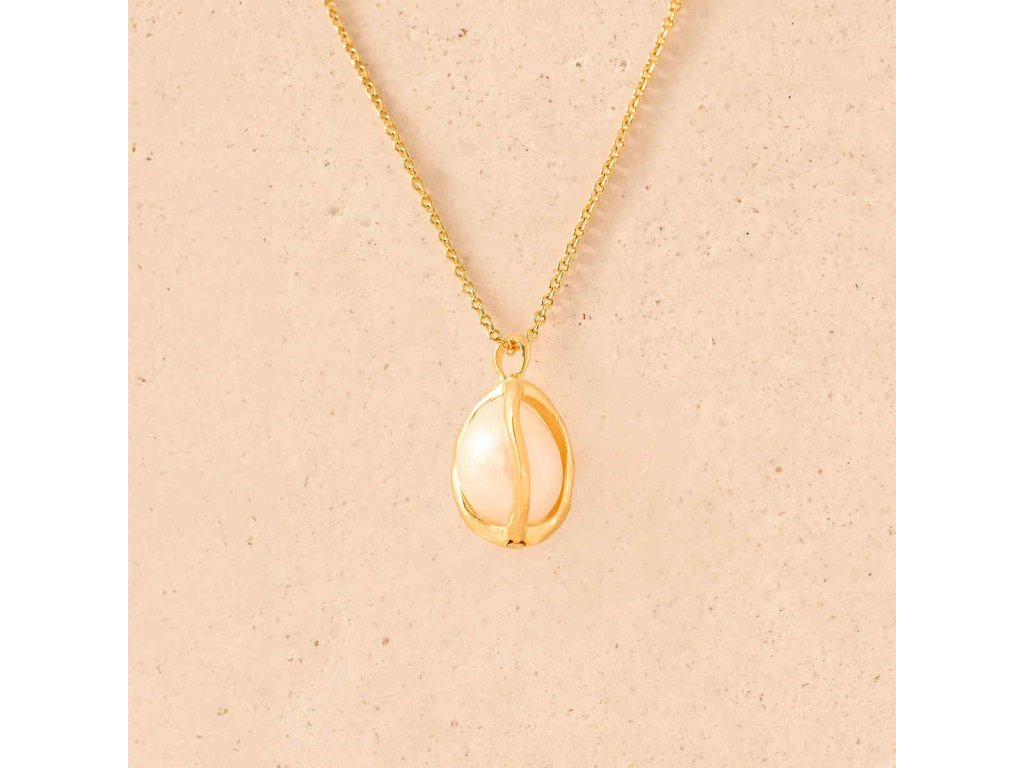 Náš okouzlující přívěsek Daria „perla v kleci“ ukrývá velkou sladkovodní perlu v nepravidelné, organicky tvarované zlaté konstrukci.